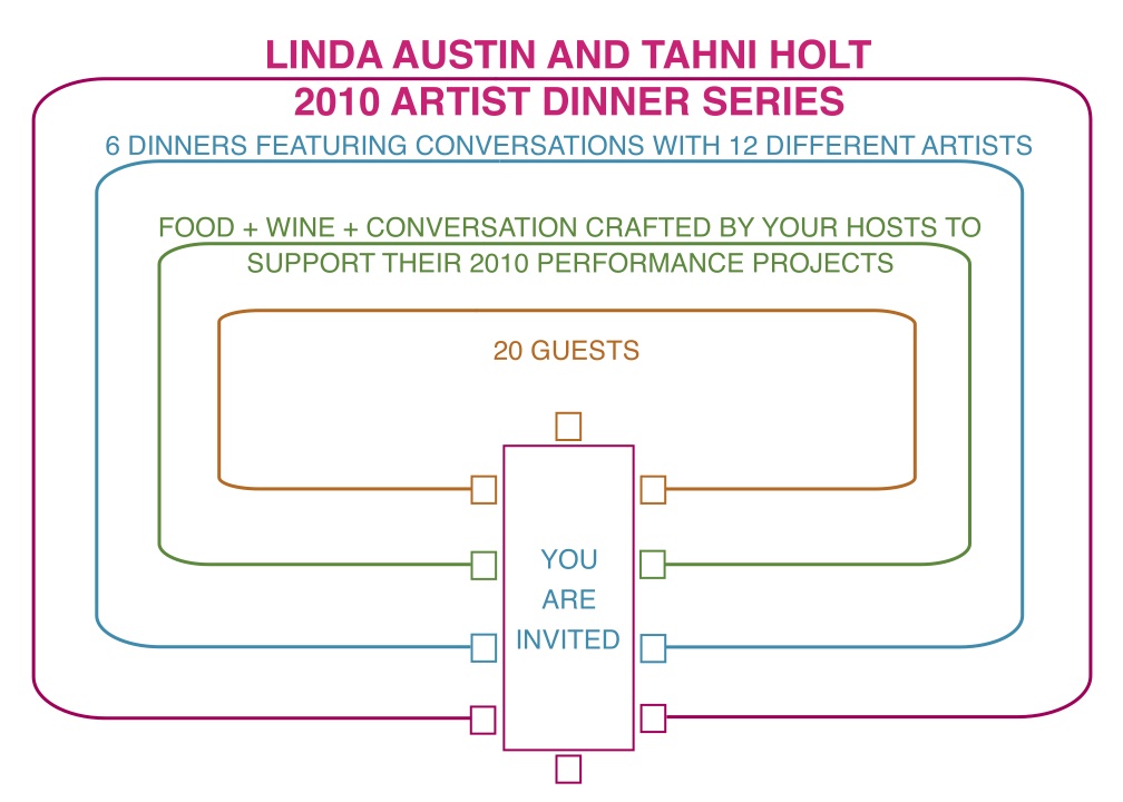Once again: provocative and fun conversation with two guest artists while enjoying dinner cooked by Linda Austin & Tahni Holt, served with love and wine.