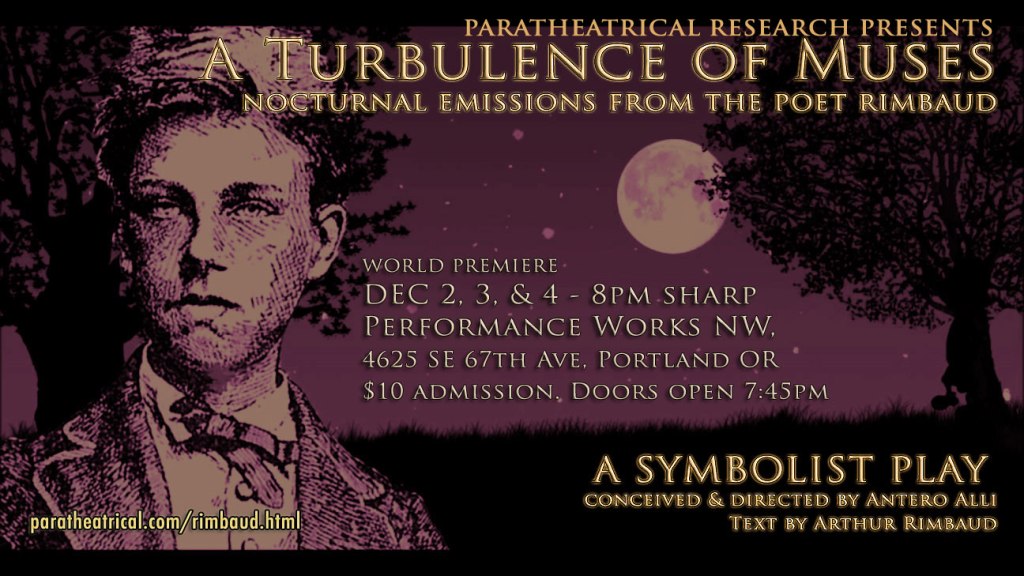 “After 20 years of paratheatrical experiments, music and film production in Berkeley California, my wife/collaborator Sylvi Alli and I relocated to Portland one year ago. “A TURBULENCE OF MUSES” is the world premiere of our symbolist performance ritual of eight players representing diverse aspects of one entity, the poet Rimbaud, undergoing a series of experiments in the systematic derangement of all the senses towards the creation of poetry. Is this a ritual disguised as theatre or theatre disguised as a ritual ? Or some avant garde extraterrestrial poetry slam? All perceptions are gambles.” —Antero Alli