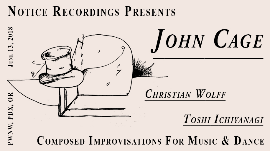 Notice Recordings presents, in collaboration with The Extradition Series, a night of contemporary music and dance by John Cage, Christian Wolff, and Toshi Ichiyanagi. Featuring Matt Hannafin, Margaret McNeal, Lee Elderton, Evan Lindorff-Ellery, Branic Howard, and Brandon Conway. Joined by movement artists Emily Jones and Taka Yamamoto.