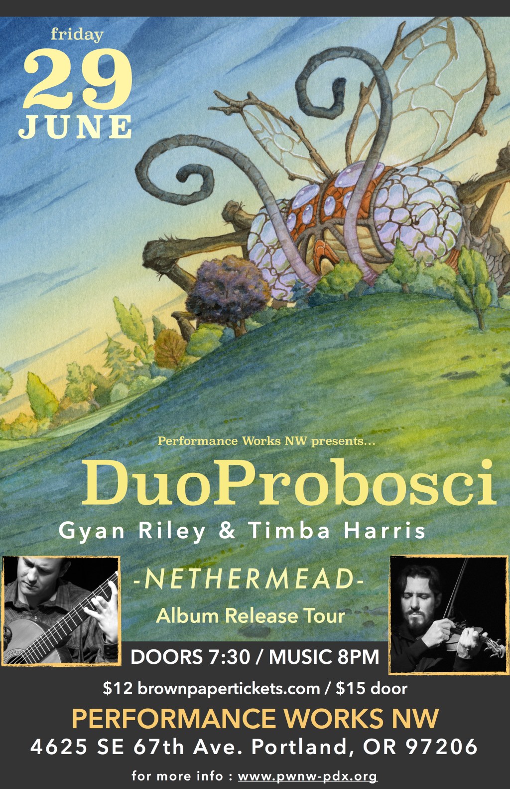 How to describe the captivating creations of an occasionally humorous, cutting-edge violin-guitar duo whose music defies all genre pigeonholing? Surely the stinging name that guitarist Gyan Riley and violinist Timba Harris chose for their electroacoustic duo — Duo Probosci, in this case, derives from the bloodsucking appendage of the mosquito — offers no hint of their most assuredly benign, albeit intensely musical energized excursions that tend to bore into you and seize you with their beauty. —The Seattle Times