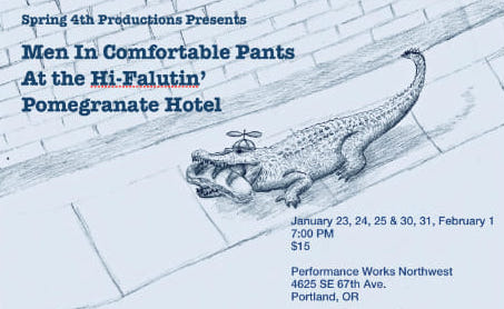 Writing/performing duo Tobin Gollihar and Ian Paul Sieren return to the Fertile Ground festival for the fifth time with their latest original play, Men In Comfortable Pants At The Hi-Falutin’ Pomegranate Hotel a high, broad comedy about two brothers struggling with their family’s legacy.