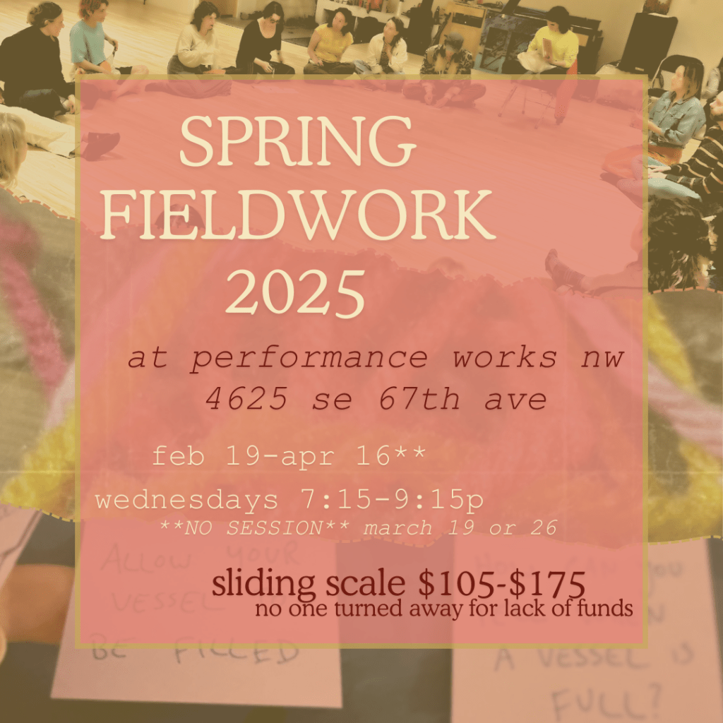 Fieldwork is a framework for artists of any and every discipline to play, experiment, fail, collaborate, and most importantly, give and receive structured peer feedback. The primary goal of Fieldwork is to provide structure and support for an artist’s process. Fieldwork approaches this goal by providing artists with a place to: show work and get feedback; develop their abilities to see work and put their reactions into useful comments; combat the isolation that can come with being an artist; have a weekly deadline structure; meet other artists as peers, potential collaborators and/or performers; and to participate in discussions with other artists.
