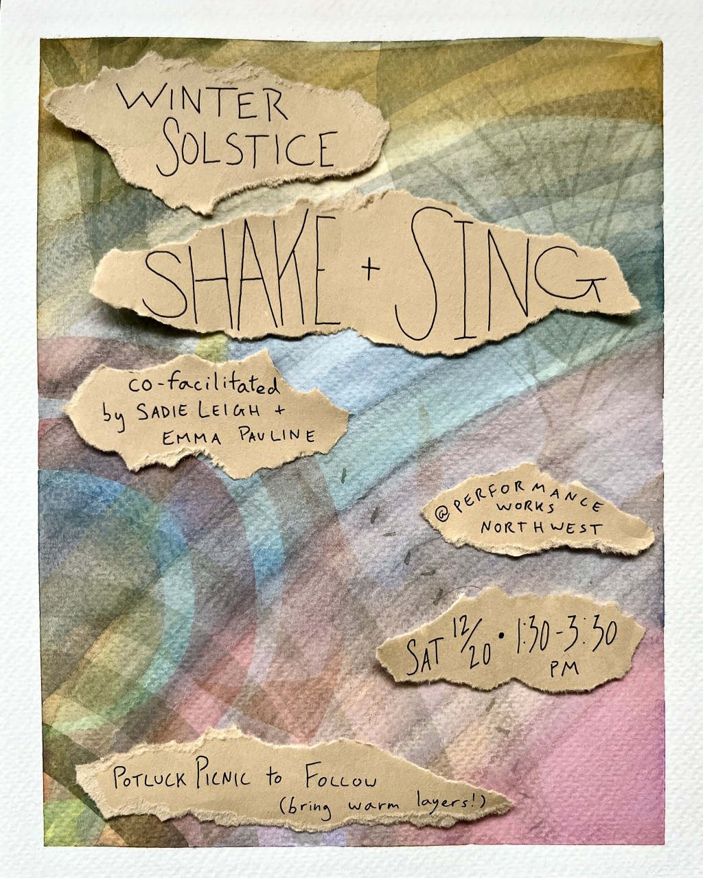 shake + sing is a low stakes movement and voice workshop and gathering. participants come together for a physical, guided shaking warm up, followed by group singing involving rhythm and rounds. if you’ve ever moved your body in any way or ever made any sounds with your mouth, this offering is for you!!