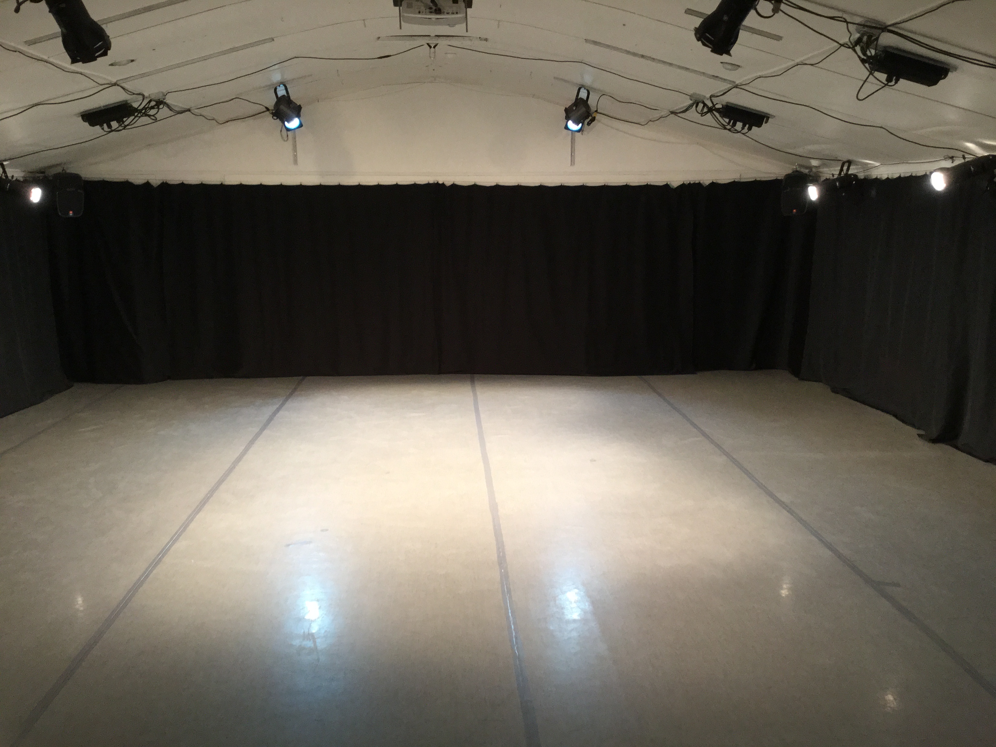 - The performance area is about 30 feet wide by 25 feet deep. The walls and ceiling are white. There are black curtains that can cover the side and back walls for something closer to a black box effect, or white curtains around the 3 sides for a lighter feeling.