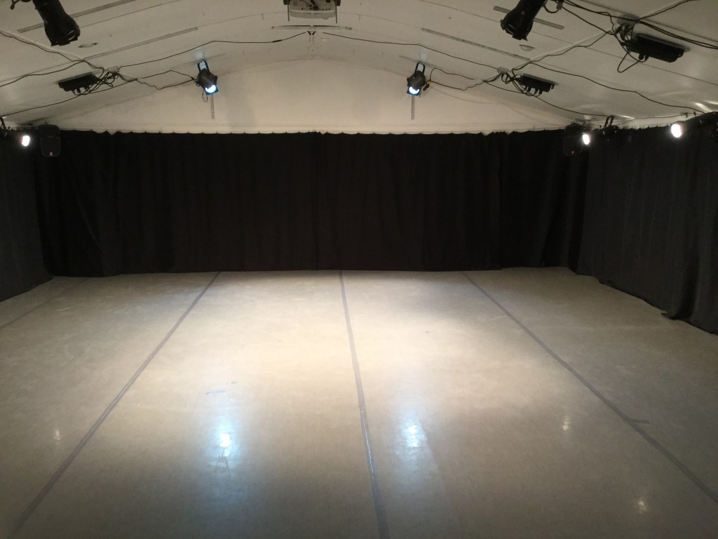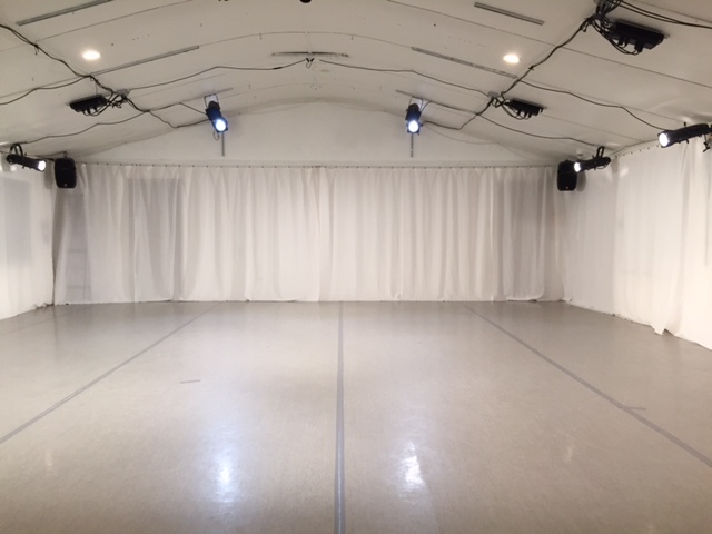 - The performance area is about 30 feet wide by 25 feet deep. The walls and ceiling are white. There are black curtains that can cover the side and back walls for something closer to a black box effect, or white curtains around the 3 sides for a lighter feeling.